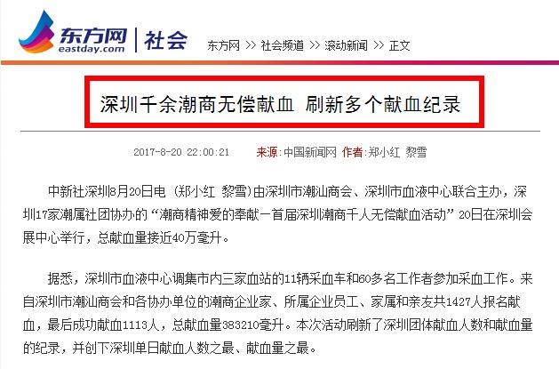 据悉,深圳市血液中心调集市内三家血站的11辆采血车和60多名工作者参加采血工作。来自下载安装 和各协办单位的潮商企业家、所属企业员工、家属和亲友共1427人报名献血,最后成功献血1113人,总献血量383210毫升。本次活动刷新了深圳团体献血人数和献血量的纪录,并创下深圳单日献血人数之最、献血量之最。