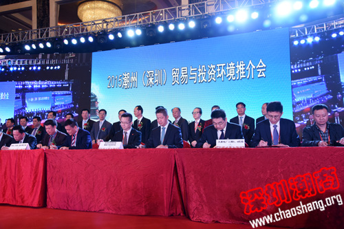 2015年3月29日下午,由中共潮州市委、潮州市人民政府主办的2015潮州(深圳)贸易与投资环境推介会在深圳市福田区香格里拉大酒店隆重举行。现场签约合作项目共32个,投资总额达329亿元。