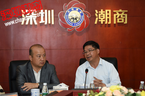 黄榕城会长向张乙坤会长(左)一行介绍潮汕商会近几年的发展情况