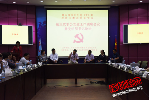 汕头市非公经济党委书记孔德镐,汕尾市非公党工委书记吴明光,潮州市工商联副主席黄小莹,揭阳市工商联副主席郑武标等潮汕四市非公党(工)委领导参加了会议。我会党委书记邓东,党委副书记、纪委书记姚欣强,党委副书记、深圳市汕头商会党委书记周木亮,党委委员、党办主任黄耀光,党委委员卓振波、陈镇文、黄毓君组织并参加了会议。