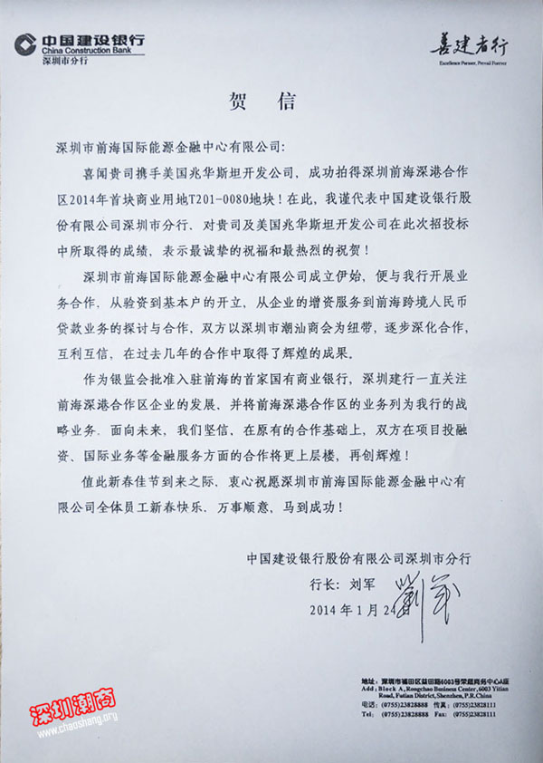 喜闻我会潮商集团控股的深圳市前海国际能源金融中心联手美国兆华斯坦开发公司,成功拍得深圳前海深港合作区2014年首块商业用地,2014年1月24日,中国建设银行股份有限公司深圳市分行行长刘军发来贺信表示祝贺,并希望双方在金融方面的合作可以更上一层楼!