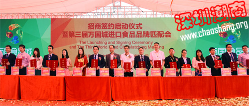 2015年4月26日上午,深圳万国食品博览城(以下简称“万国食品城”)隆重举办招商签约启动仪式暨第三届进口食品品牌匹配会。来自5大洲16个国家驻穗总领事、商务领事,700名嘉宾,150家海内外食品生产厂商,400多家采购商,38家境内外媒体记者齐聚万国食品城,共同见证招商签约启动盛况。
