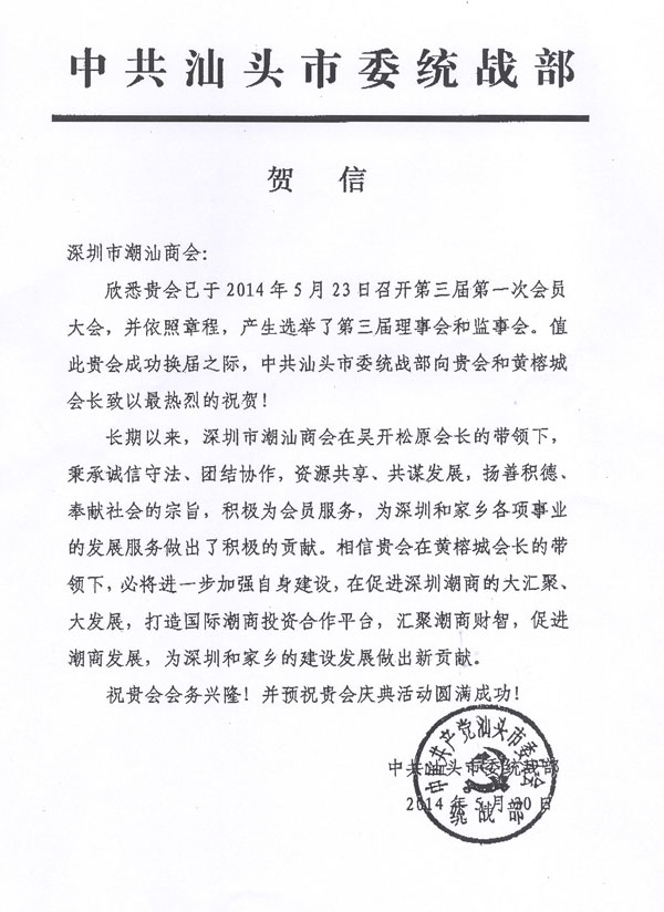 中共汕头市委统战部贺信