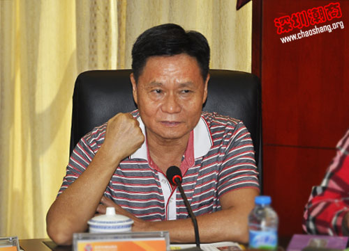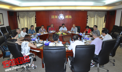 黄榕城致欢迎辞,向来访一行介绍了潮汕人在深圳的发展情况,并从商会的组织架构、几大工作模块以及商会投资的各个经济实体,对商会的运营情况做了介绍。