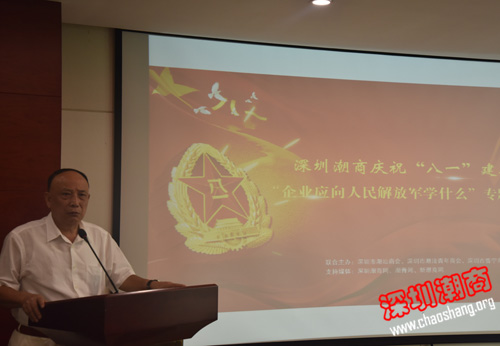 常务副会长、普宁商会执行会长周南在讲座上致辞,他说商会举办这样的活动是传播军人正能量的一种方式,有助于潮商企业的振兴发展。用军人的作风,军队的管理来建设企业,能使企业管理更加有纪律性,更有效率。