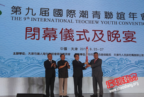 26日晚,蔡东士主席、郭丰海主席、胡剑江执行会长完成“薪火相传”仪式,第九届国际潮青联谊年会圆满闭幕。大会宣布了,第十届国际潮青联谊年会将于2018年在香港举办。