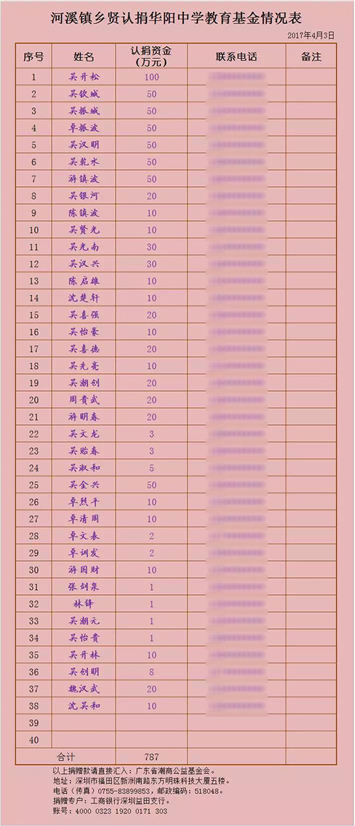 2017年4月3日晚,汕头市潮阳区河溪镇委、镇政府隆重举行在外乡贤座谈会,旨在集民资汇民智,共谋河溪教育发展大计。河溪镇委书记张松等领导出席座谈会。下载安装 创会会长、永远荣誉会长吴开松,名誉会长卓振波、吴金兴,监事长吴振城,副会长游镇波、吴光南、陈启雄,常务理事吴乾水、吴贤光、沈楚轩、吴淑和,理事卓烈平、吴怡贵等出席座谈会,并在创会会长、永远荣誉会长吴开松的倡导下,支持成立华阳中学教育基金会。吴开松创会会长带头为基金会认捐一百万元,在场乡贤等纷纷响应,踊跃认捐。截至4月3日晚10点止,共有38位乡贤认捐,认捐金额787万元。以上捐赠款直接汇入广东省潮商公益基金会。