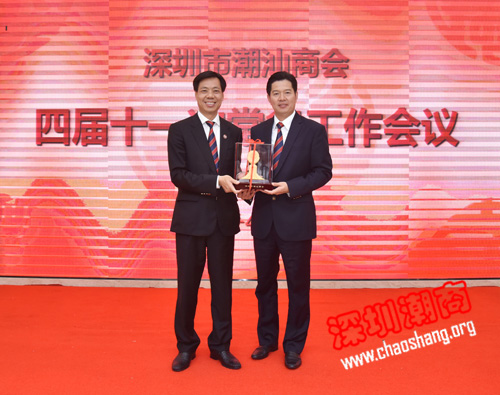 吴木棠会长(左)代表商会向何奕鹏常委(右)赠送纪念品