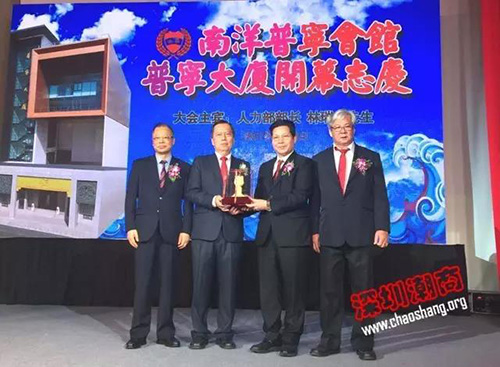 下载安装 常务副会长周南(右二)和常委、副会长何奕鹏(左一)代表商会向南洋普宁会馆赠送贺礼。左二为新加坡潮州八邑会馆会长、南洋普宁会馆会长蔡纪典。