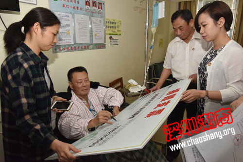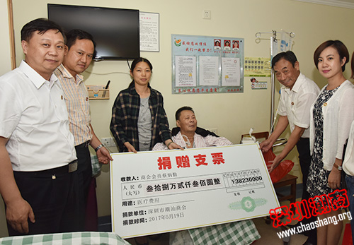 2017年5月19日下午,受吴木棠会长,黄育宏驻会会长,吴振城监事长委托,黄梓琪秘书长带领秘书处一行到广州中山大学附属肿瘤医院看望不幸罹患癌症的商会会员蔡炳勤先生,并将近日商会热心会员募捐到的38.23万元救助善款交到蔡炳勤先生手中,鼓励他积极接受治疗,早日康复。