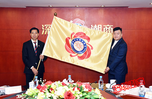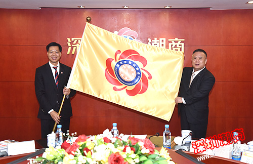 吴木棠会长(左)为胡剑江会长(右)授会旗