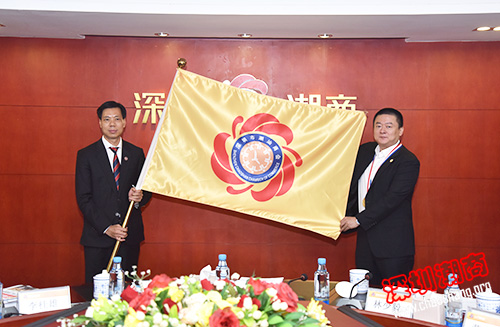 吴木棠会长(左)为李桂雄会长(右)授会旗