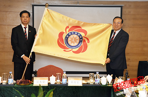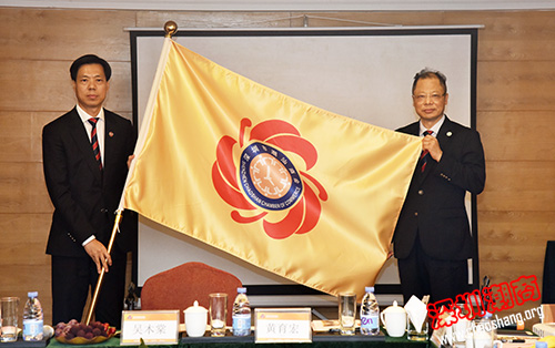 吴木棠会长(左)为佘桂锡常务副会长(右)授会旗
