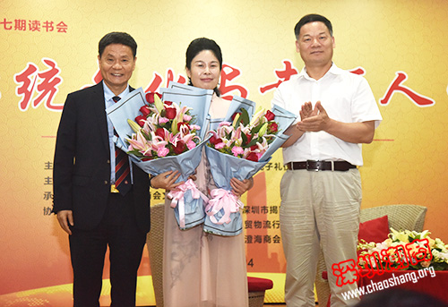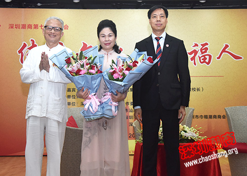 上午,深圳市工商联专职副主席、市非公党委副书记、纪委书记王荫琦(右)和我会驻会会长黄育宏(左)献上鲜花,对金辉校长精彩的讲课表示感谢