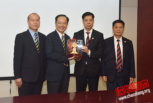 赵利生主席(左二)、黄育存常务副主席(左一)代表深圳潮青会向我会赠送纪念品