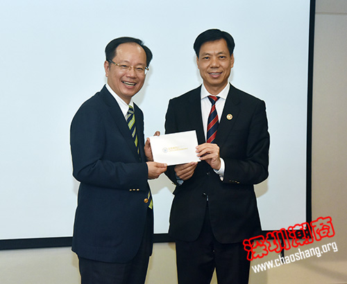 吴木棠会长(右二)、黄育宏驻会会长(右一)代表商会向深圳潮青会赠送纪念品