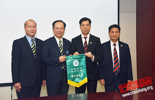 吴木棠会长(右二)、黄育宏驻会会长(右一)代表商会向深圳潮青会赠送纪念品