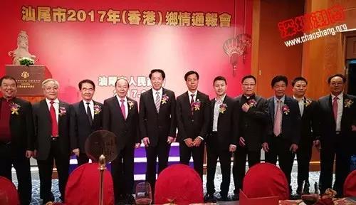 2月8日,汕尾市委市政府在香港举办2017年乡情通报会,荣誉会长龚俊龙(左四)、涂辉龙(左三)、吴木棠会长(左六)、常务副会长邱家儒(左二)、副会长黄大卫(右五)等与杨绪松市长(左五)合影