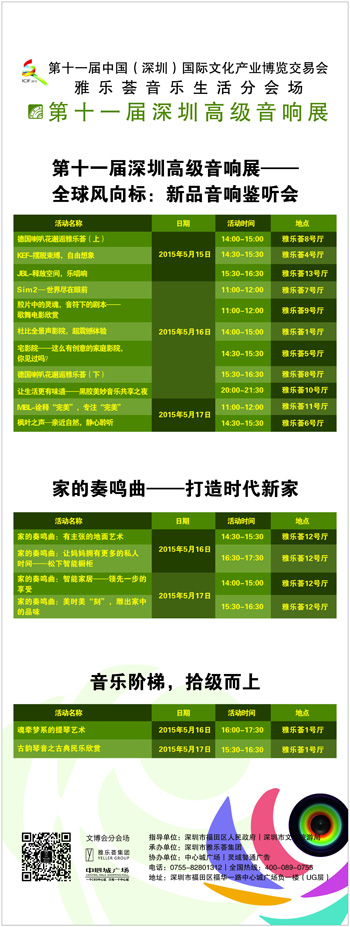 由我会常务理事单位深圳市雅乐荟投资发展有限公司承办的第十一届中国(深圳)国际文化产业博览交易会“雅乐荟音乐生活馆分会场”暨第十一届深圳高级音响展开幕式将于2015年5月15日在深圳市福田区举行。本届展会以“音乐•家•生活——梦‘响’的地方”为主题,届时市、区相关领导及国内外嘉宾将莅临开幕式现场。期间还将举办“音乐阶梯,拾级而上-中外巅峰对话”音乐会。在此,诚挚邀请您拔冗出席本此活动开幕仪式,真诚地期待着您的莅临!咨电会员部林晓云13923711850。