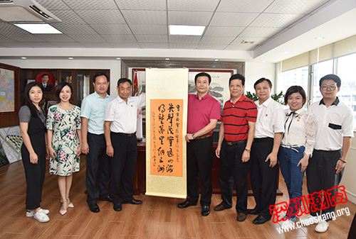 走访期间,黄梓琪秘书长代表商会为潘英明副会长授会旗、颁发牌匾、赠送纪念品和一幅书法作品作为生日贺礼,内容是:“英声茂实通四海,明鉴万里纳五洲”。