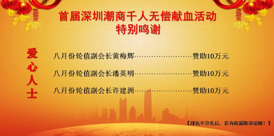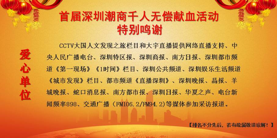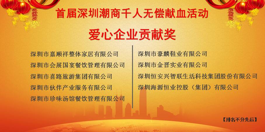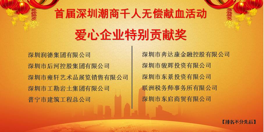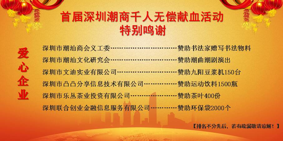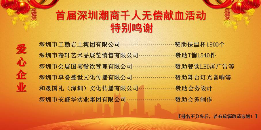 会上举行了首届深圳潮商千人无偿献血活动颁牌仪式,对荣获爱心企业奖、爱心企业贡献奖、爱心企业特别贡献奖、爱心社团、爱心组织的单位颁发荣誉牌匾。8月20日首届深圳潮商千人无偿献血活动的成功举办,离不开各潮属社团、会员企业和所有爱心人士的大力支持。正如庄礼祥书记所说,光荣属于无偿献血者,光荣属于大爱潮商。