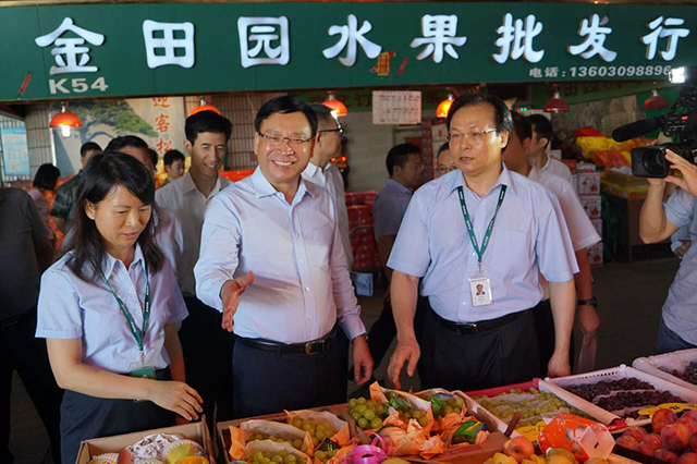 副会长彭大坚(左一)陪同市委副书记、市长陈如桂(中)一行到深圳市福田农产品批发市场有限公司检查工作