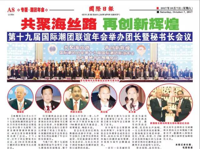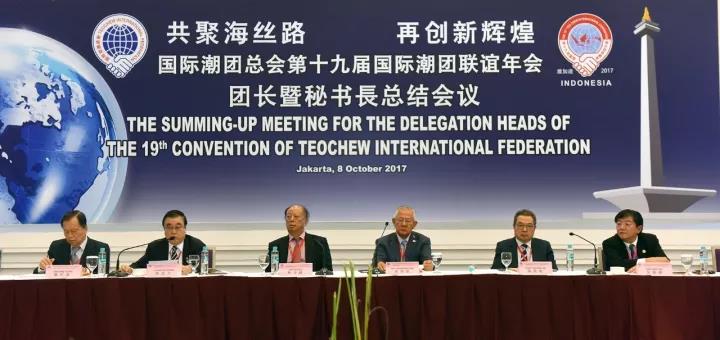2017年10月6-8日,以“共聚海丝路 再创新辉煌”为主题的国际潮团总会第十九届国际潮团联谊年会在印尼雅加达BSD-ICE 国际会展中心隆重举行。来自全球29多个国家和地区及国内潮团嘉宾近2000人出席,相聚雅加达,共叙潮人佳话、共商发展大计。