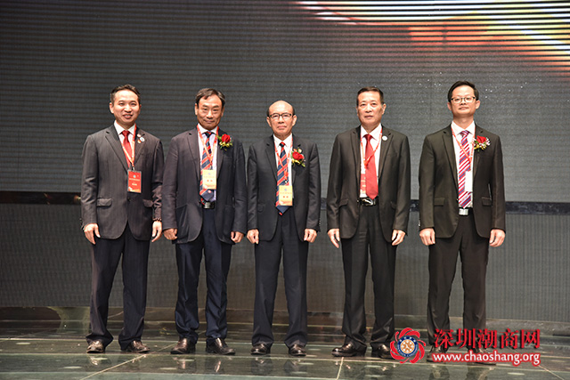 我会党委书记邓东(中),澄海区委常委统战部部长林典发(右一),深圳市汕头澄海商会会长朱英顺(右二),深圳市汕头澄海商会副会长、我会理事蔡淳林(左一),我会副会长兼秘书长黄梓琪(左二)上台见证中共深圳市汕头澄海商会支部成立仪式