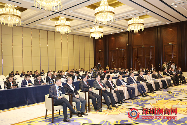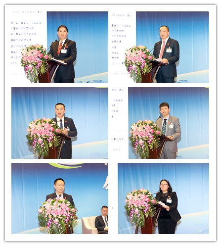 重庆市潮汕商会会长江文填、广东省潮商会会长周奕丰、潮州市团委书记陈锦辉、汕头市团委书记张磊、揭阳市团委书记孔博、汕尾市团委书记刘莉丽演讲