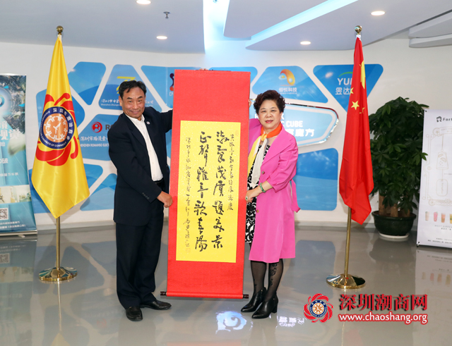 走访期间,黄梓琪秘书长代表商会为吴淑音副会长授旗、颁发牌匾并赠送一幅书法作品作为生日贺礼。书法对联内容是:“淑气茂质题美景,正声雅音歌春阳”。