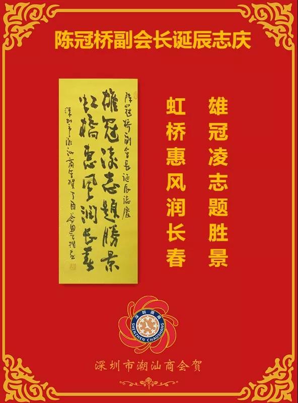 12月9日是陈冠桥会长的生日,商会秘书处送上对联书法和鲜花以表祝贺。书法对联内容是:“雄冠凌志题胜景,虹桥惠风润长春”。