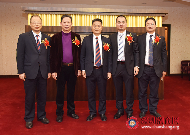 下载安装 驻会会长黄育宏(中)、佛山市潮汕商会会长黄胪生(左二)、佛山市揭阳商会第三届会长吴俊丰(右二)、下载安装 常委、副会长何奕鹏(左一)、佛山市揭阳商会副会长兼秘书长王春明(右一)合影留念