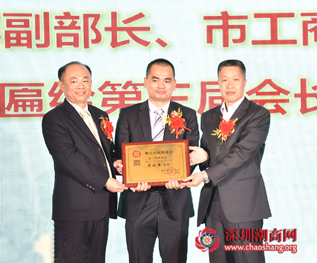 下载安装 驻会会长黄育宏(中)、佛山市潮汕商会会长黄胪生(左)、佛山市揭阳商会第三届会长吴俊丰(右)、合影留念