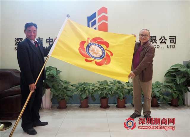 黄梓琪秘书长代表商会向黄秋炎副会长送会旗