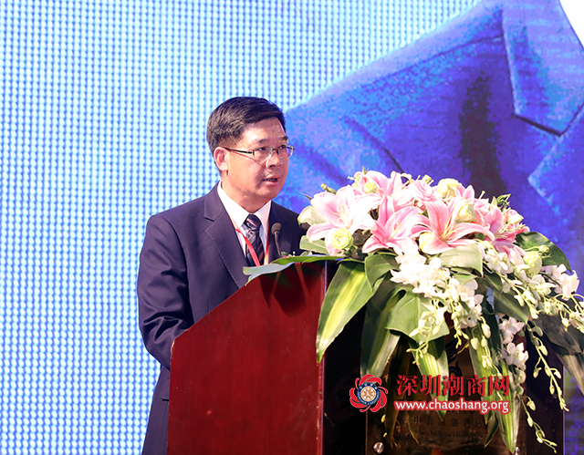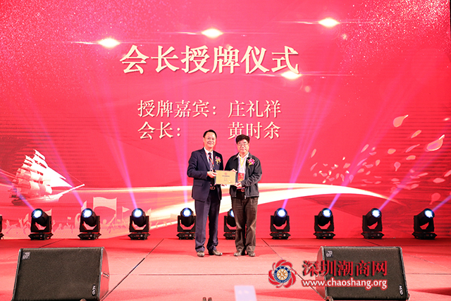 深圳市委原副书记、深圳市商业联合会会长庄礼祥为深圳市揭阳商会第三届会长黄时余授牌
