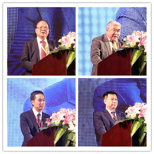 国际潮团总会永远荣誉会长、湖北省潮人海外联谊会会长陈少荣(左上),广东省揭阳商会会长林榜昭致辞(右上),深圳市揭阳商会第三届驻会会长张秦孝作理事会财务报告(左下),深圳市揭阳商会第三届监事长黄旭初作第二届监事会报告(右下)