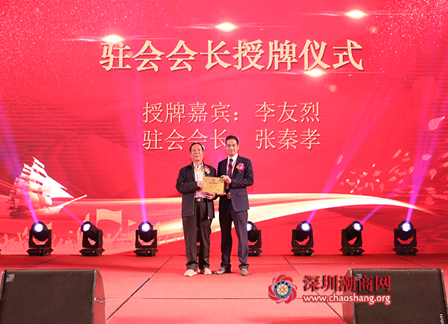 深圳市人大常委会原副主任、深圳警备区原司令员李友烈为深圳市揭阳商会第三届驻会会长张秦孝授牌