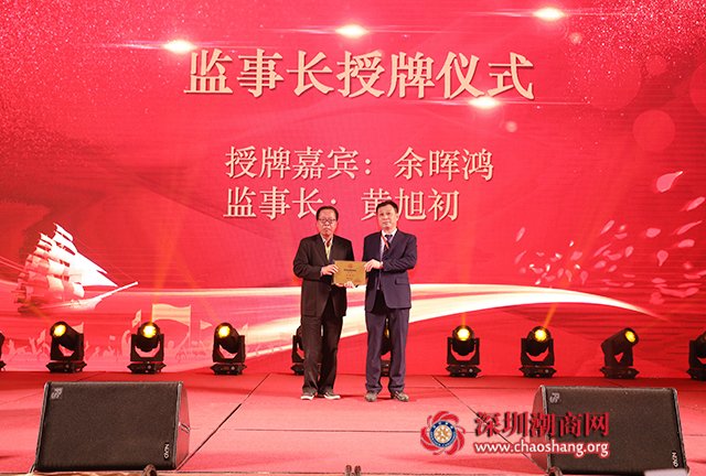 深圳市政协原副主席余晖鸿为深圳市揭阳商会第三届监事长黄旭初授牌