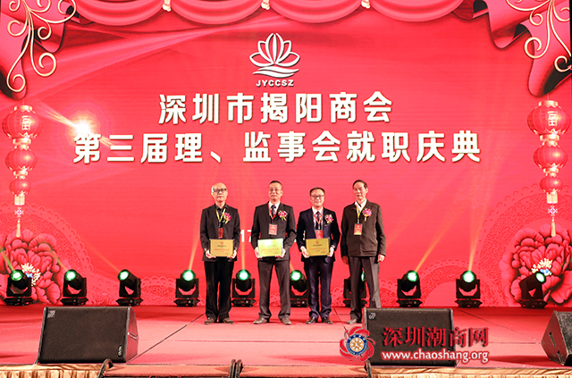深圳市揭阳商会战略顾问委员会主席郑宇平、经济发展委员会主席倪潮锋、文化战略委员会主席陈妙财获牌