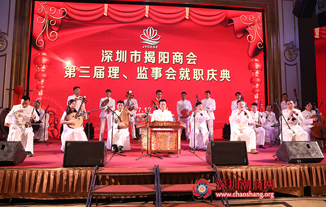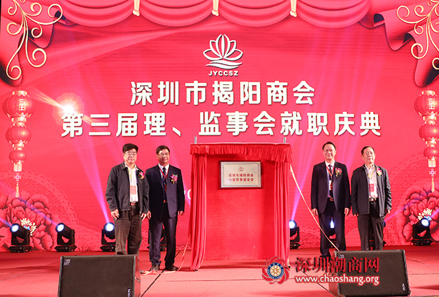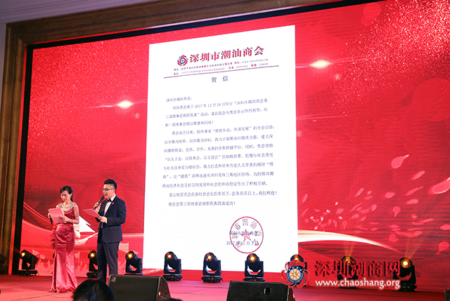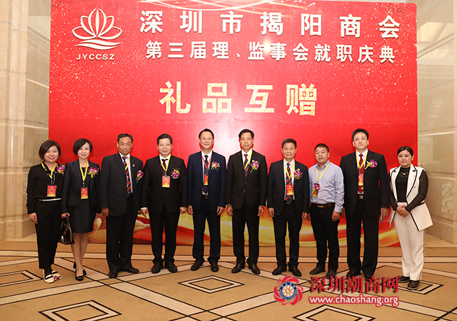 2017年12月30日下午,深圳市揭阳商会第三届理事会、监事会就职庆典在中海凯骊酒店隆重举行。揭阳市、深圳市有关部门领导、海内外社团来宾、深圳市揭阳商会及青联成员800多人参与盛会。深圳市老领导庄礼祥伉俪、李友烈、余晖鸿、姚欣耀、黄国祥,揭阳市副市长姚丽璇,共青团揭阳市委书记孔博,揭阳市榕城区委书记江林生,揭阳市榕城区委常委、统战部部长唐超,深圳市委统战部副部长唐向群,龙岗区政协主席吴书坤,深圳市贸促委副主任黄史昉等领导出席庆典。