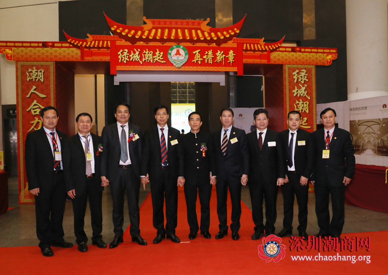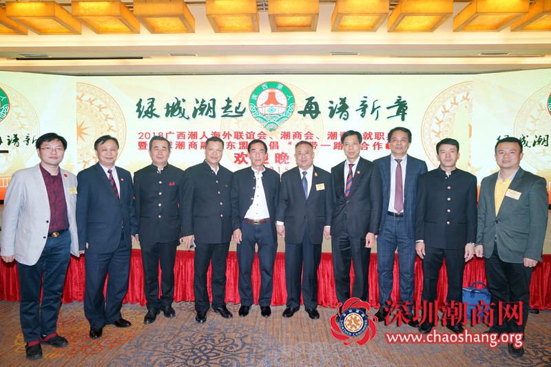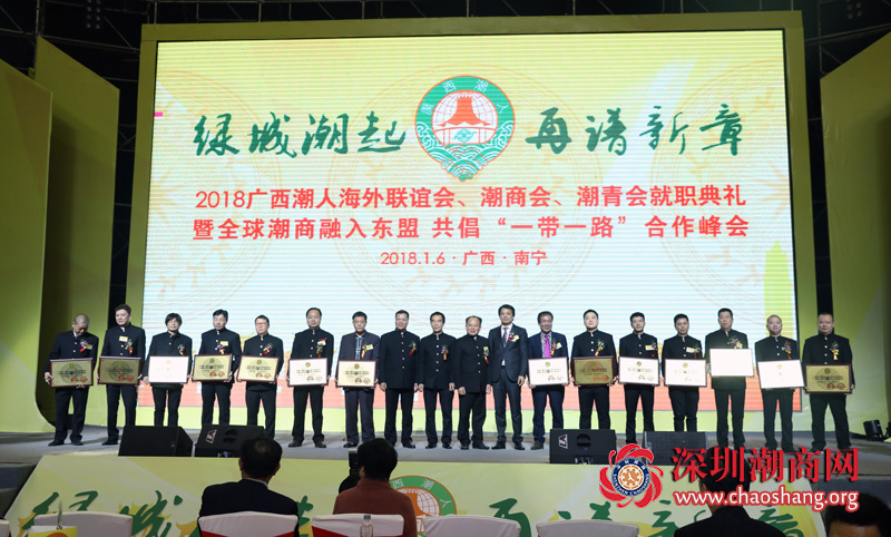 2018年1月6日下午,以“绿城潮起 再谱新章”为主题的广西潮人海外联谊会第六届理事会、广西潮商会第三届理事会、广西潮青会第二届理事会就职典礼暨全球潮商融入东盟共倡一带一路合作峰会在南宁会展中心隆重举行。中央人民政府驻香港联络办(以下简称“中联办”)常务副主任黄兰发,中联办港岛工作部副部长陈旭彬,广西壮族自治区党委统战部部务委员冯华清,广西壮族自治区投资促进局副局长郑娟,南宁市团委书记王亚楠,汕头市委统战部副部长、市工商联党组书记孔德镐,汕头市总商会主席黄茂强,揭阳市工商联党组书记林少光,汕尾市工商联副主席庄切,潮州市工商联副主席黄小莹等领导以及海内外多个潮属社团代表及广西潮人会、潮商会、潮青会全体成员等共800多人出席大会。