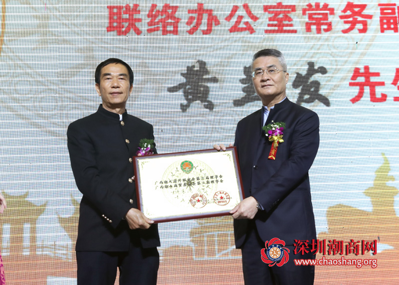 会上,广西大和平投资开发有限公司、广西大和平房地产开发有限公司董事长许朱鸿就任新一届广西潮人会、潮商会会长,黄兰发常务副主任为许朱鸿会长颁牌。广西誉发投资有限公司董事长陈东发就任广西潮人会、潮商会执行会长。广西恒泰保安服务有限公司、广西冠桂建设集团有限公司董事长孙镇生就任广西潮青会会长。大会为三会的副会长以上成员举行了颁牌仪式。本会常委、副会长何奕鹏被聘为广西潮人会、潮商会顾问。
