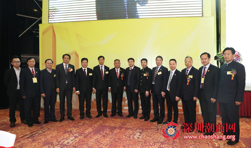 在1月5日晚举行的欢迎晚宴上,吴木棠会长(右四)等与广西潮人会、潮商会会长许朱鸿(左五)、执行会长陈东发(左四)、广西潮青会会长孙镇生(右二)、国际潮青联合会会长、泰国华人青年商会会长李桂雄(右五)等合影