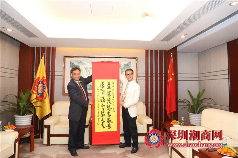 走访期间,黄梓琪秘书长向陈森豪轮值副会长送上会旗、纪念品和一幅书法作品。书法内容是:“森荣茂德展盛景,豪气凌云聚长春”。