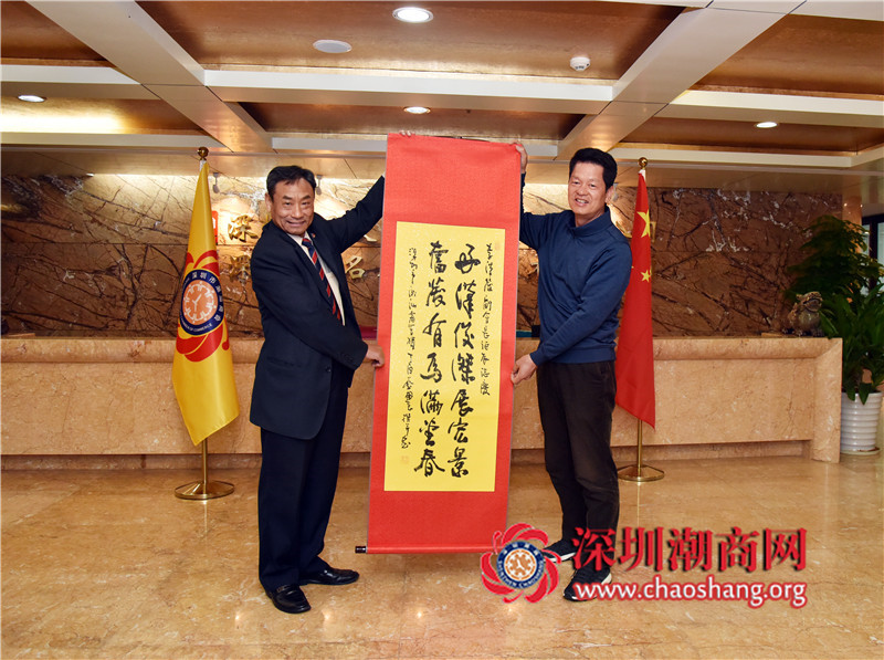 走访期间,黄梓琪秘书长向李汉发副会长送会旗、纪念品和一幅书法作品。书法内容是:“好汉俊杰展宏景,奋发有为满堂春”。