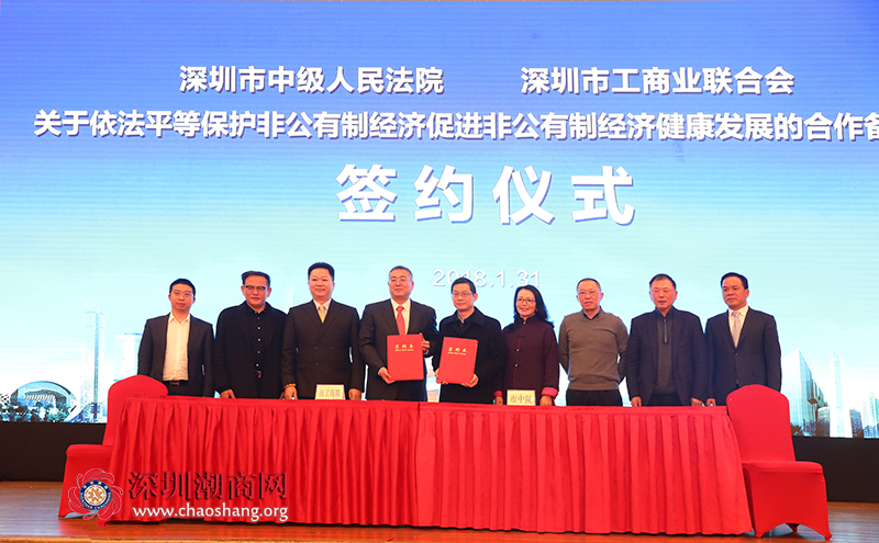 会上,市工商联与市中级人民法院签署《关于依法平等保护非公有制经济促进非公有制经济健康发展的合作备忘录》,建立完善市工商联系统与全市各级法院常态化联系、司法大数据互通、司法保护典型案例发布、协同调研宣传培训、商事纠纷诉调对接等五大机制,为深圳非公有制经济健康发展营造良好法治环境。此次签约标志着深圳市非公有制经济法律保障机制进一步完善。