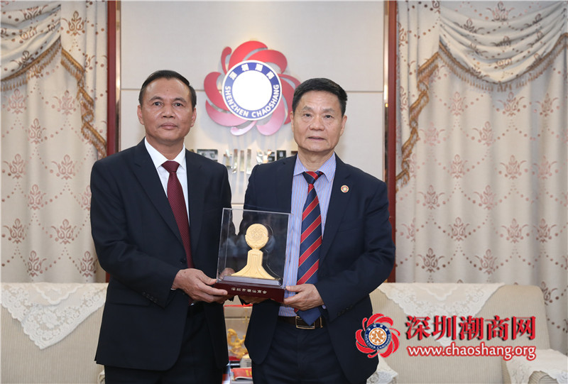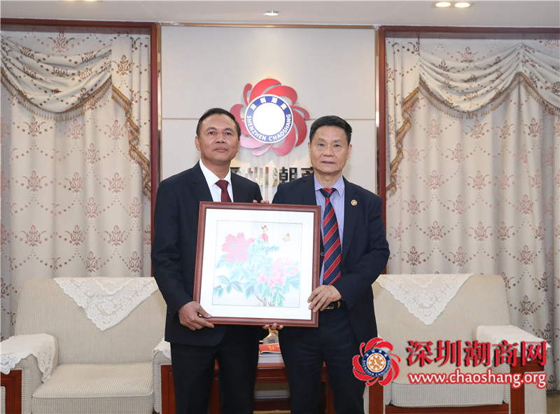 潮州市工商联主席詹建怀(左)赠送纪念品
