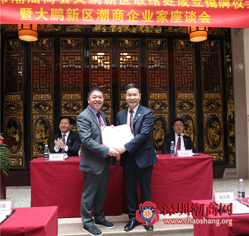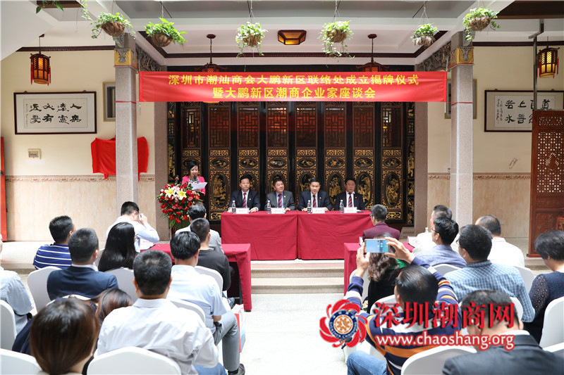 驻会会长黄育宏,轮值会长方武权、林锦乙,副会长、大鹏新区联络处主任李科枝,轮值副会长陈汉武、谢元硕,副会长林伟泉、许烈丰,常务理事李佳、杨继文、洪绵(代表),副秘书长余清风,会长助理谢和治,常务副秘书长兼会员发展服务中心主任陈媛,及三科控股集团有限公司总经理黄育新,大鹏新区罗马假日民宿董事长宋小乔,深圳市瓷缘文化有限公司副总经理林泽伟,深圳市兴俊业纸品有限公司董事长陈伟波,深圳市东星城酒店有限公司董事长陈少荣,深圳市金钱通信息咨询有限公司总经理方文森,深圳市金钱通信息咨询有限公司董事长王喜明,深圳市蓝田农产品进出口贸易有限公司董事长陈泽洲,深圳市易德发投资发展有限公司董事长马楚和,深圳市金胜景园林有限公司董事长林耿松,深圳市南澳经济发展有限公司汽车修配厂董事长傅进利等大鹏新区潮商企业家、商会秘书处成员共40余人见证成立揭牌仪式并进行座谈。陈媛常务副秘书长主持仪式。
