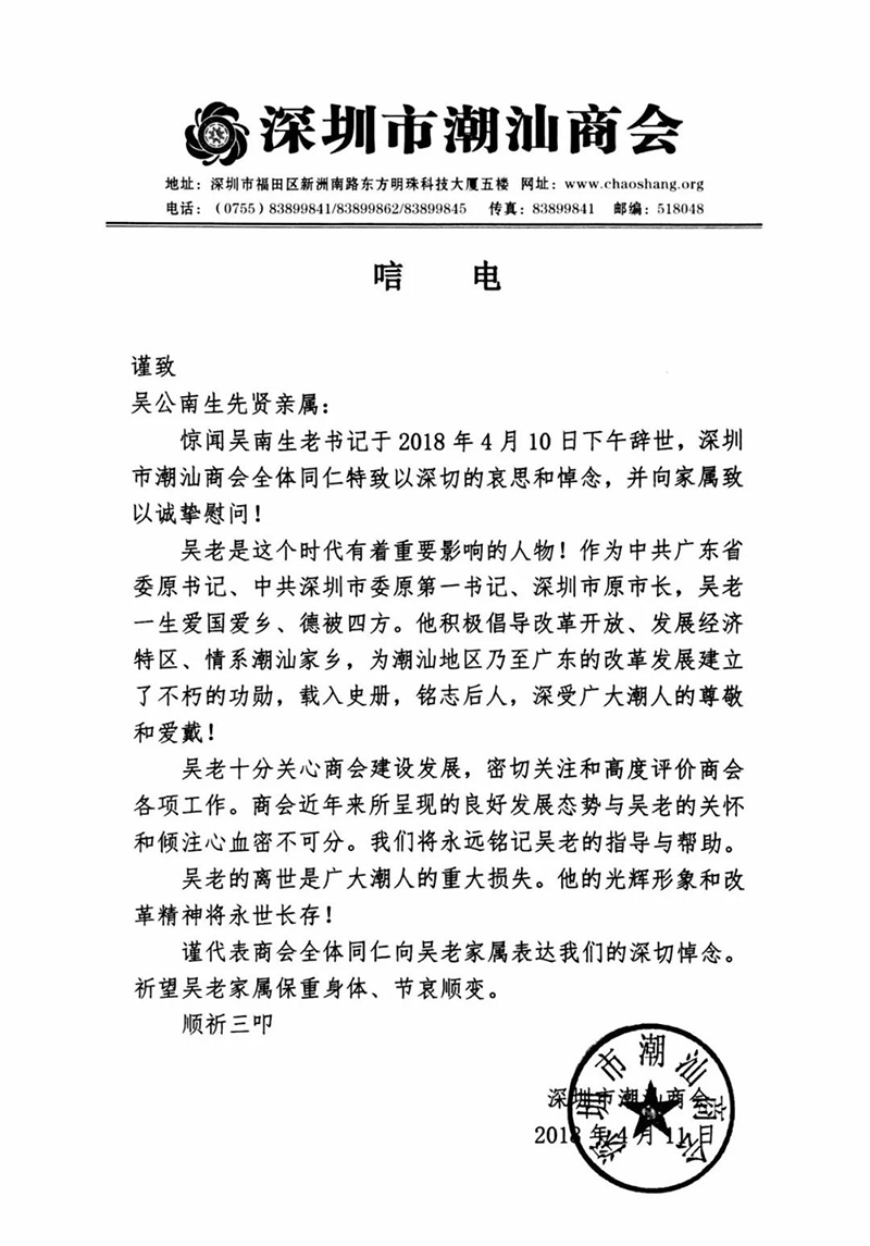 4月18日上午,受吴木棠会长、黄育宏驻会会长、吴振城监事长委托,常务副会长兼秘书长黄梓琪代表商会前往广州送别吴南生同志,商会致送花圈表示深切的哀思和悼念,吴南生同志走好!