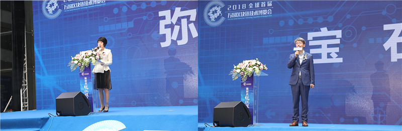 北京支持雄安产业发展促进会副会长兼秘书长弥雪,万国区块链技术博览会组委会秘书长、深创学院创始人宝石致辞